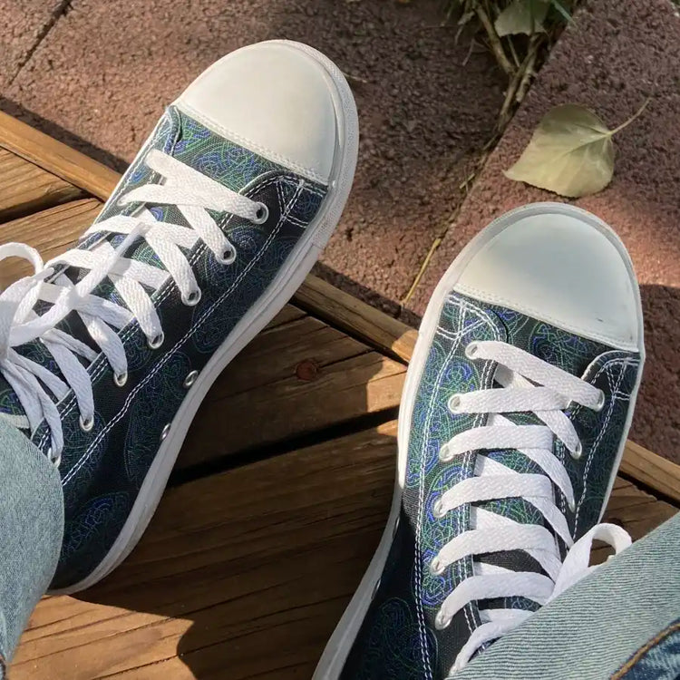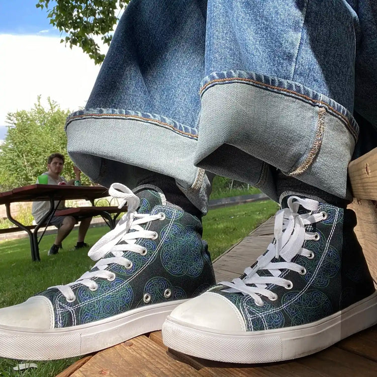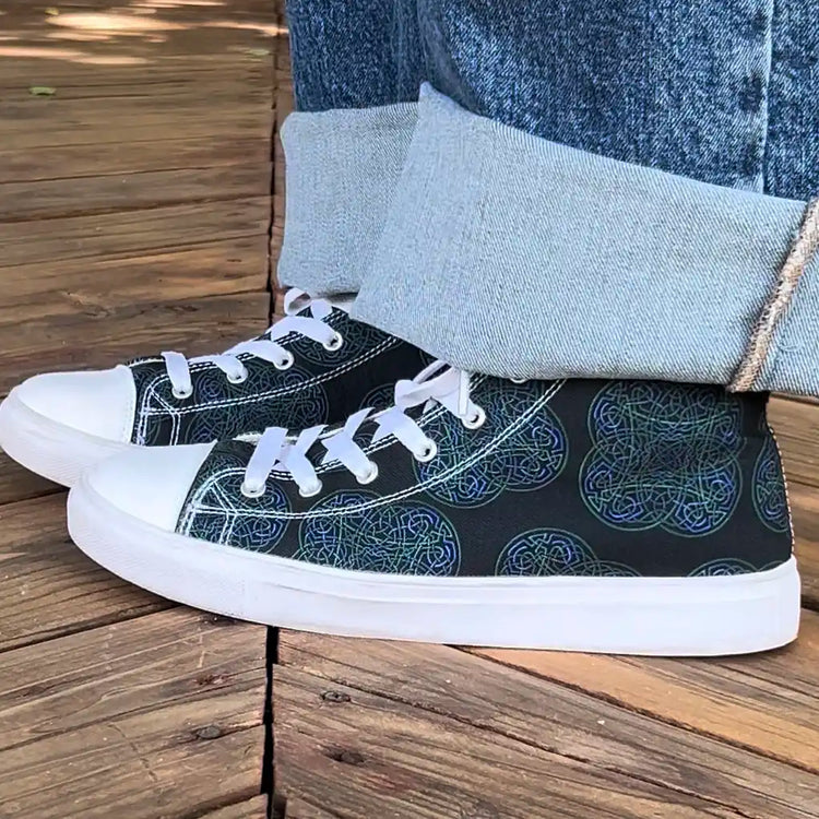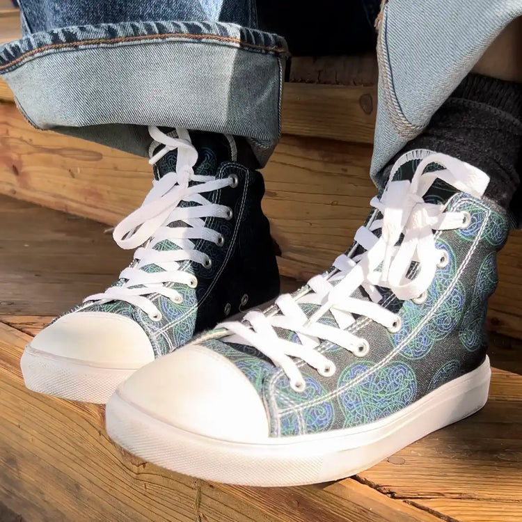 Step up your shoe game with the High Top Canvas Shoes featuring a patterned series of the original Living Colour iteration of the `Reach Of The Spirit` Celtic knot design with a solid black background. These handmade, trendy shoes are sure to spice up your outfit. Get yours now!